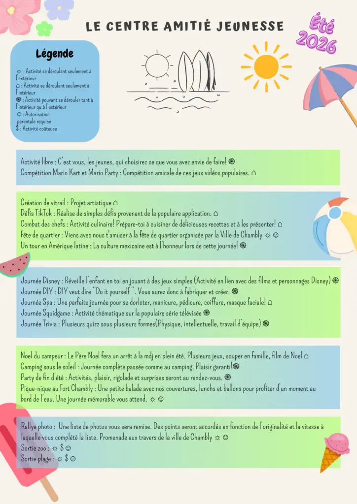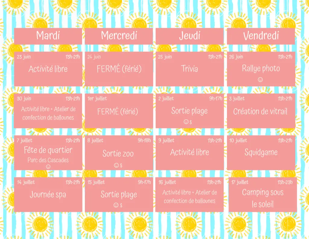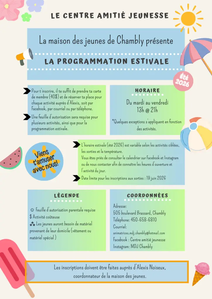 La programmation estivale est mise en ligne lors du mois de mai sur nos réseaux sociaux ainsi que sur notre site web. Nous invitons les jeunes à s’inscrire au préalable pour les activités de l’été à la maison des jeunes, par téléphone ou sur nos pages Facebook et Instagram. Les jeunes doivent prévoir un lunch pour souper ou apporter de l’argent pour aller se chercher à manger dans un des restaurants près de la MDJ. Les inscriptions aux activités de l’été sont obligatoires puisque les places sont limitées à 20 jeunes/activité.